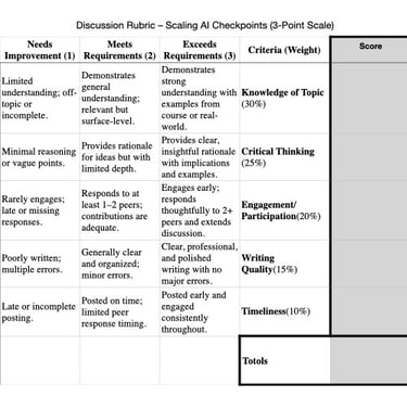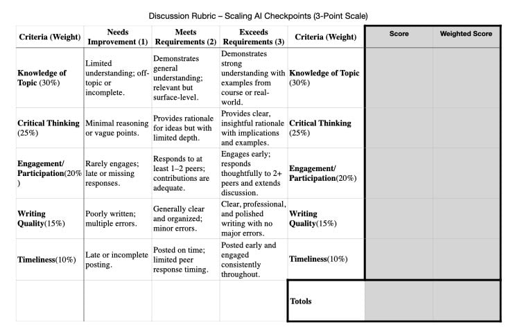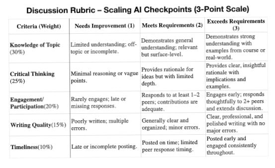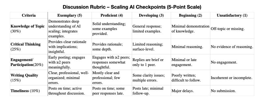 Late Work: Discussions must be posted on time; assignments accepted up to 48 hours late (10% penalty).
