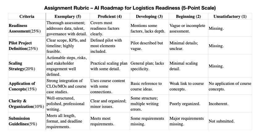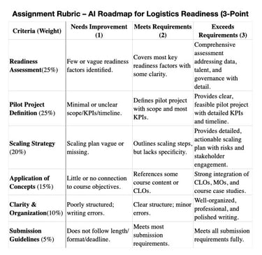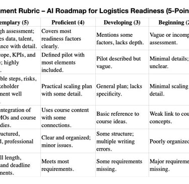 This 60–90 minute mini eLearning course explores how artificial intelligence (AI) is transforming logistics. Learners will analyze real-world case studies, evaluate organizational readiness, and develop an AI roadmap for operational excellence.